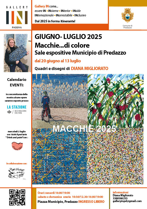La forma nuova dello spazio artistico nato in Via Umberto a Padova nel 2022 è ora itinerante. Gallery IN si trasforma e da luogo fisso diventa nomade! Ogni mese ci saranno diverse iniziative dedicate all’arte, agli artisti, ai curatori, ai collezionisti, agli appassionati del bello a cui sarà rivolto un invito di partecipazione. La nuova esperienza inizia con una mia mostra personale, in un luogo che potrà ospitare anche altri in futuro. Vi invito a venire a trovarmi per vedere le mie opere. Da fine marzo e ai primi di aprile a Salò. MACCHIE di Diana Migliorato 4 sezioni di quadri: divisionismo, paesaggi, trame e gocce! Dal 28 marzo al 10 aprile, aperto dal venerdì alla domenica, con orario 10.00-19.00. Presso Sala Domus in fianco al Duomo di Salò Brescia, in fianco alla riva del Lago di Garda. Vi aspetto ! Diana