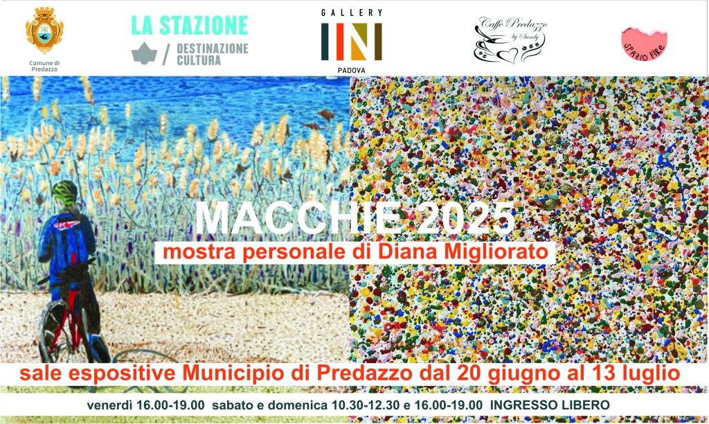 Sta per chiudere la mostra intitolata “MACCHIE 2025” opere pittoriche della pittrice padovana Diana Migliorato: l’artista sarà presente con una selezione delle sue opere – quadri, disegni e stampe – presso le sale espositive del Municipio di Predazzo fino a domenica 13 luglio 2025. La mostra, sarà aperta al pubblico il pomeriggi di Giovedì e Venerdì dalle 16.00 alle 19.00. Sabato e domenica dalle 10.30 alle 12.30 e dalle 16.00 alle 19.00.