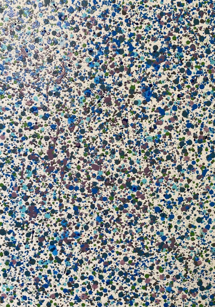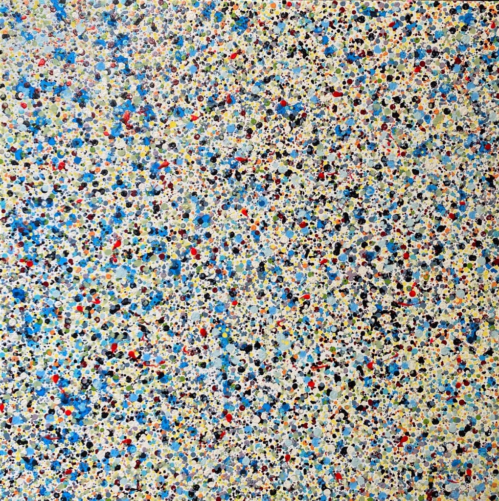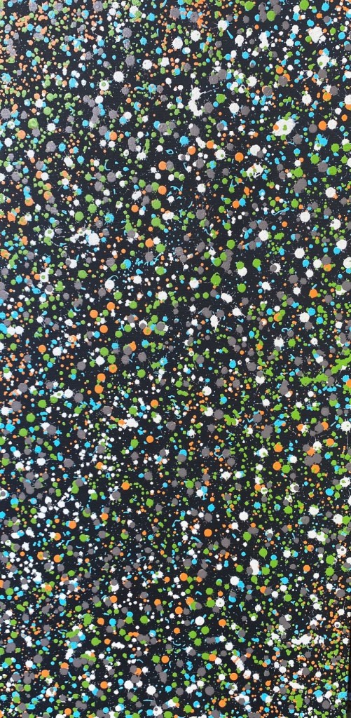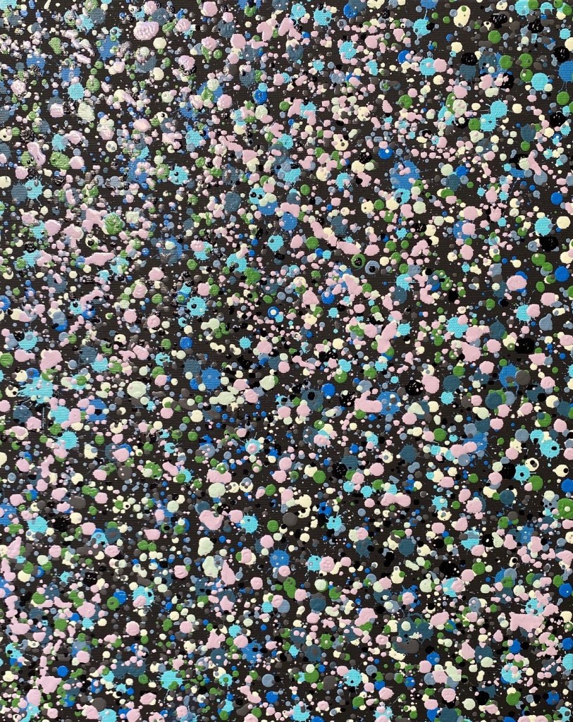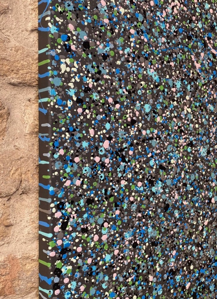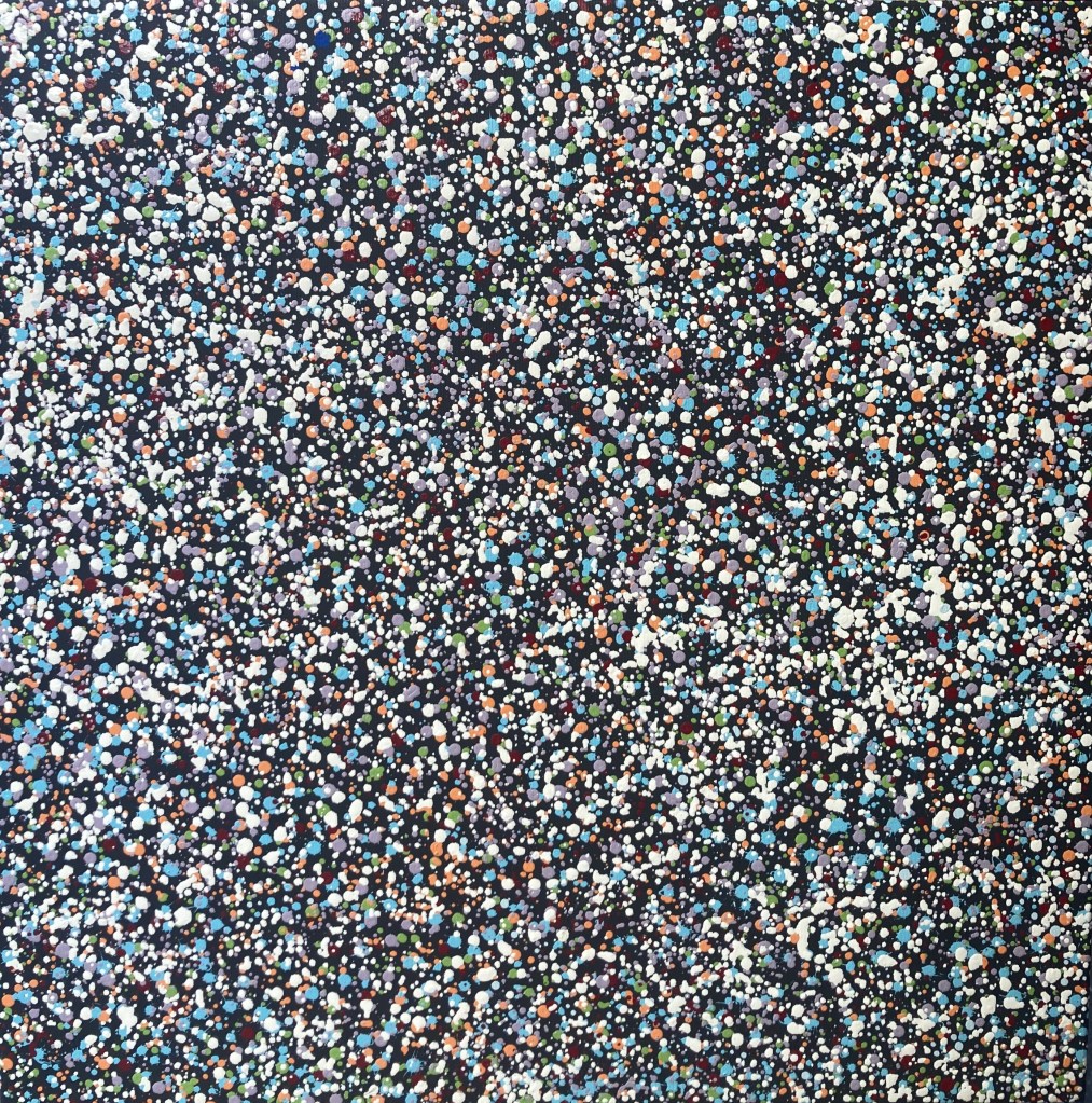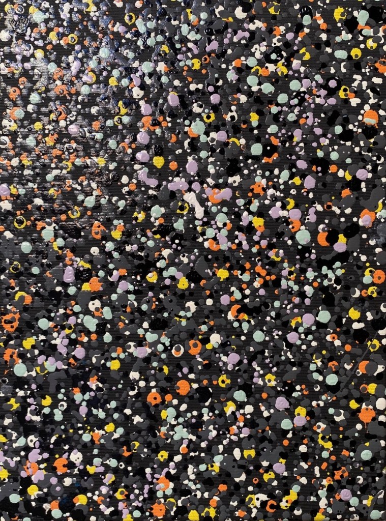 Molteplici gocce di colore lasciate cadere sulla tela si organizzano a formare costellazioni in un cielo nello spazio infinito e profondo.