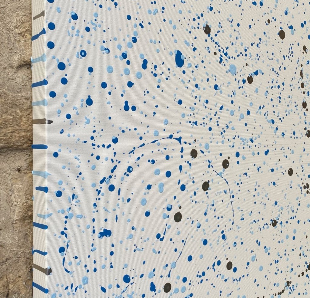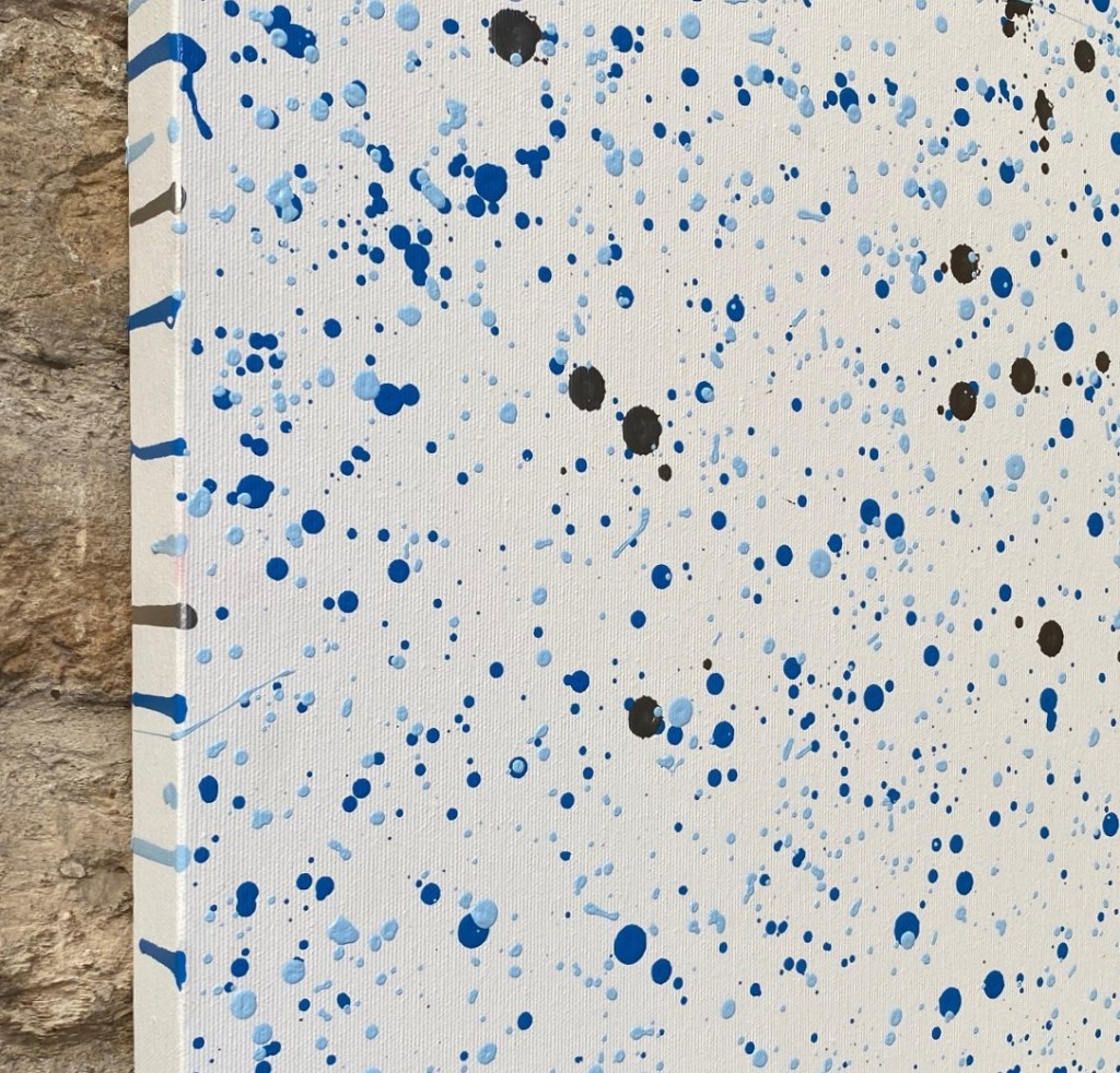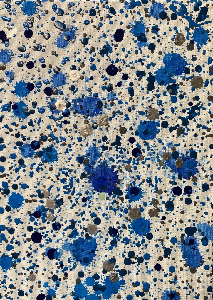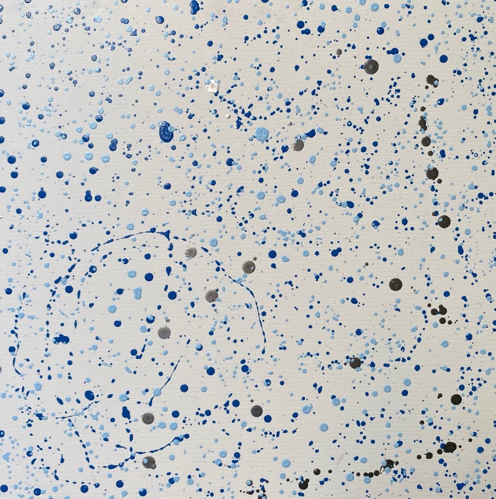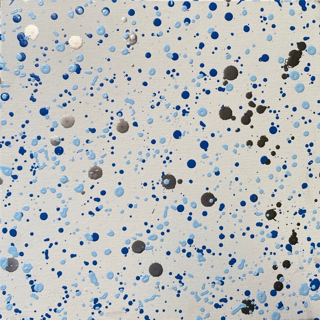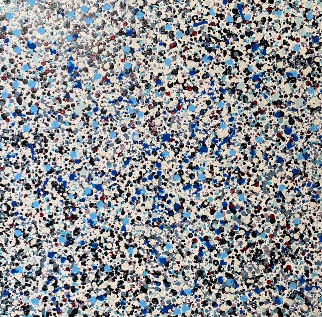 Molteplici gocce di colore lasciate cadere sulla tela si organizzano a formare costellazioni in un cielo nello spazio infinito e profondo.