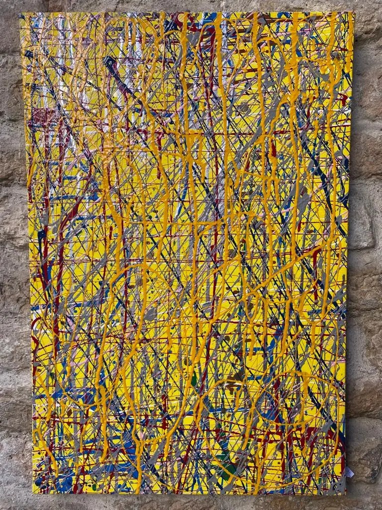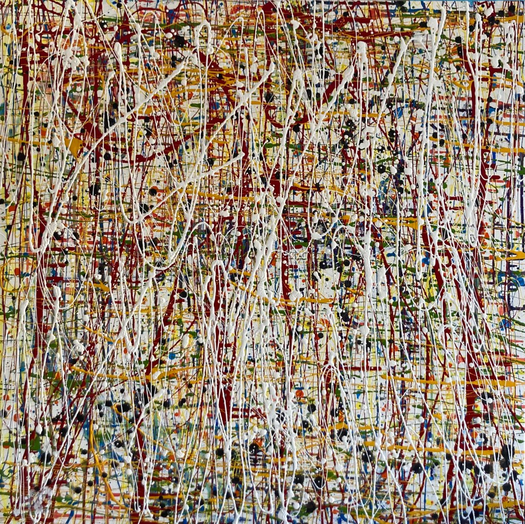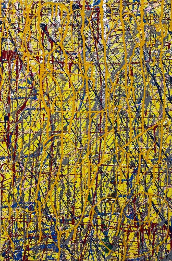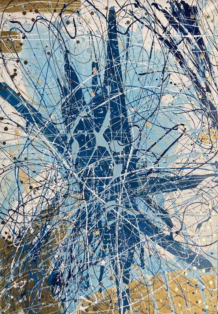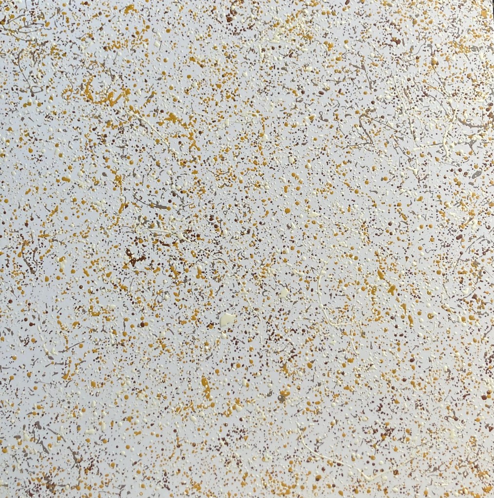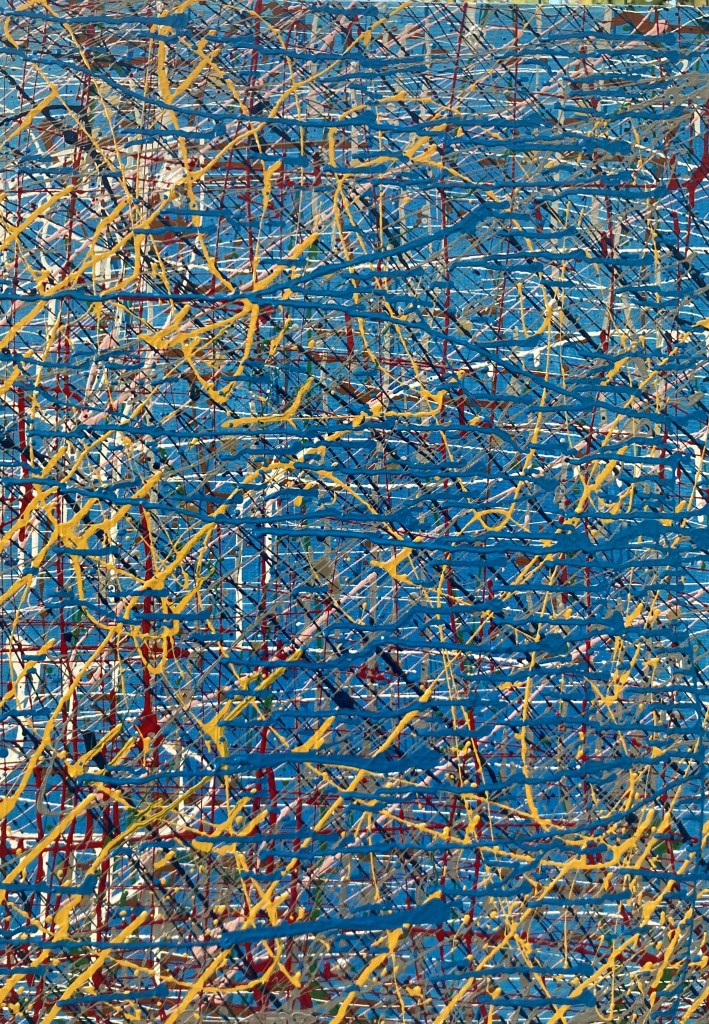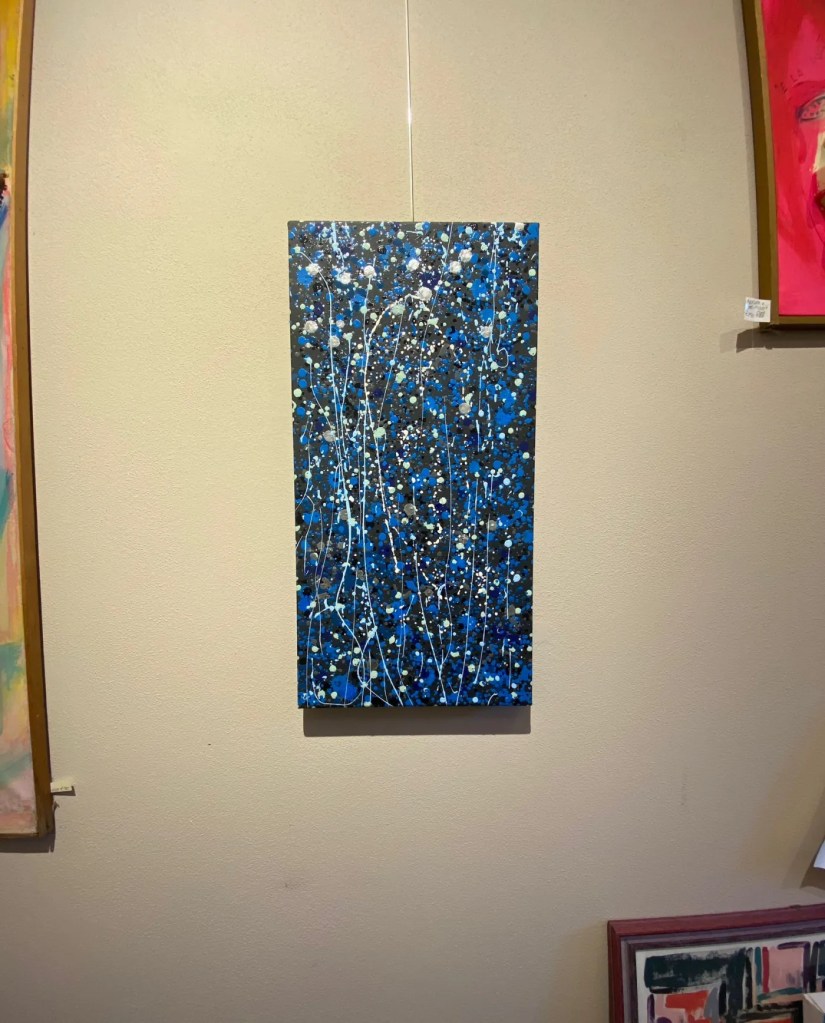 Molteplici gocce di colore lasciate cadere sulla tela si organizzano a formare costellazioni in un cielo nello spazio infinito e profondo.
