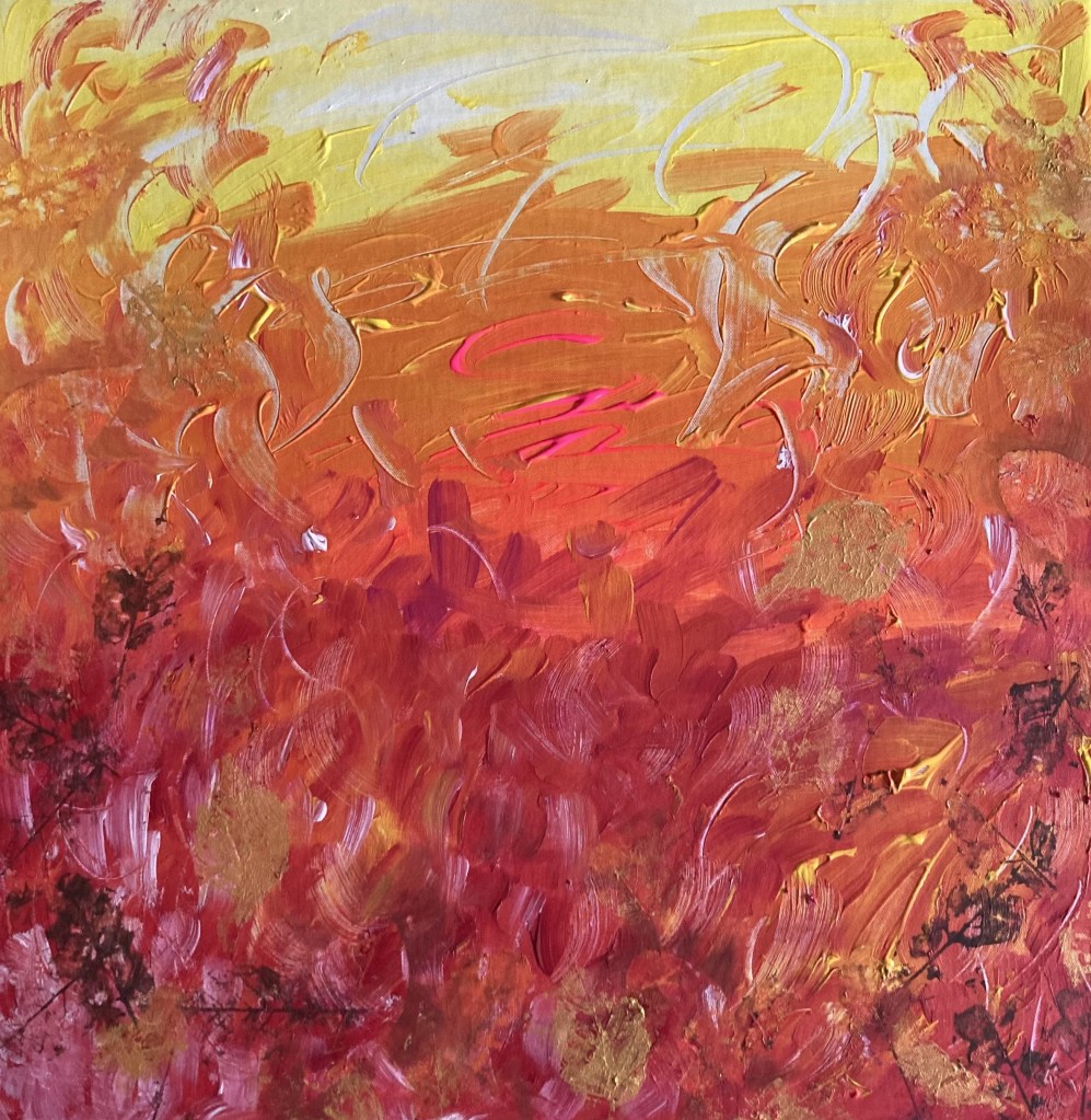 Come un paesaggio: in alto il cielo blu e sotto un prato con piante e fiori mosse dal vento a diventare un disegno di colori in cui prendono il sopravvento.