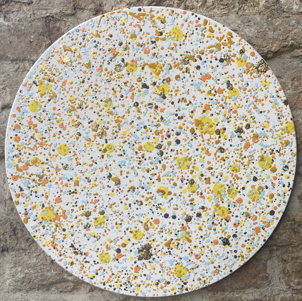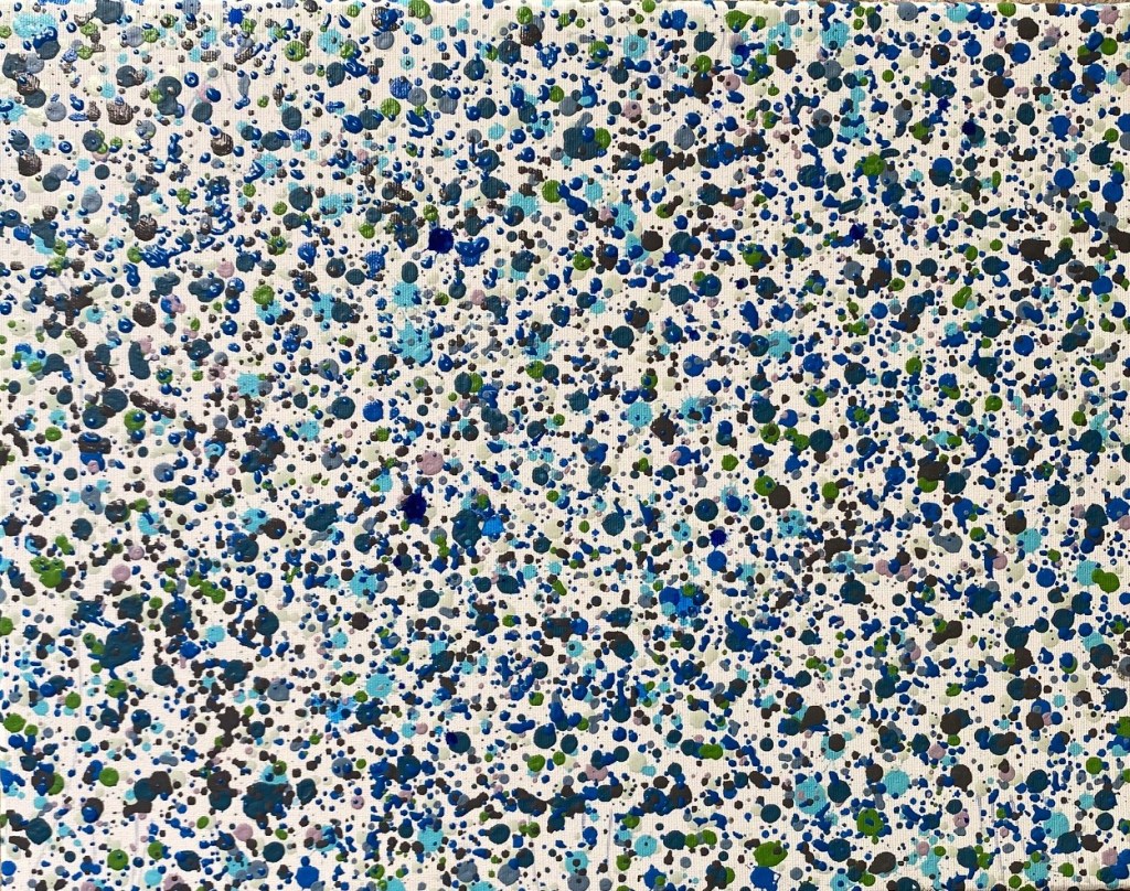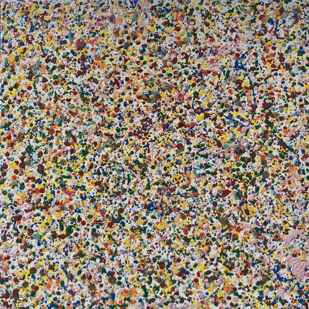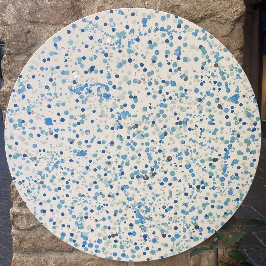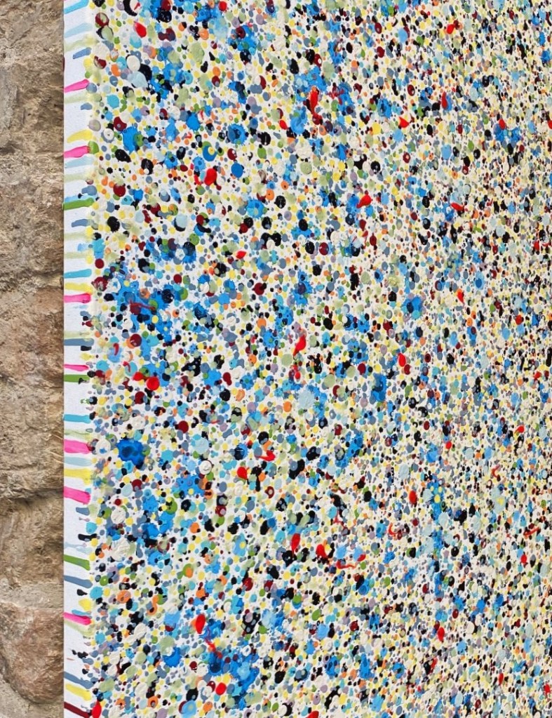 Una moltitudine di gocce e colature dall’alto che rimangono fissate sulla tela, alcune opache ma trasparenti, altre lucide e in rilievo come bottoncini nelle tonalità di diversi colori. La tela bianca, colorata o scura le accoglie generosa aspettando che si sistemino sulla sua superficie, alcune vicine, altre sovrapposte. Piccole e grandi: le diverse dimensioni donano la profondità della visione e un leggero movimento. Come molecole che vibrano in un’eterna danza. L’artista le sistema con pazienza, aspettando che scendano giù dallo strumento utilizzato a raccogliere il colore, come una sorta di meditazione. Il risultato: un microcosmo rassicurante, fresco e leggero che accoglie lo sguardo cangiante in molteplici riflessi a seconda della fonte luminosa e della posizione dello spettatore. La scelta del campo quadrato, rettangolare e rotondo determina una percezione diversa di ogni opera.