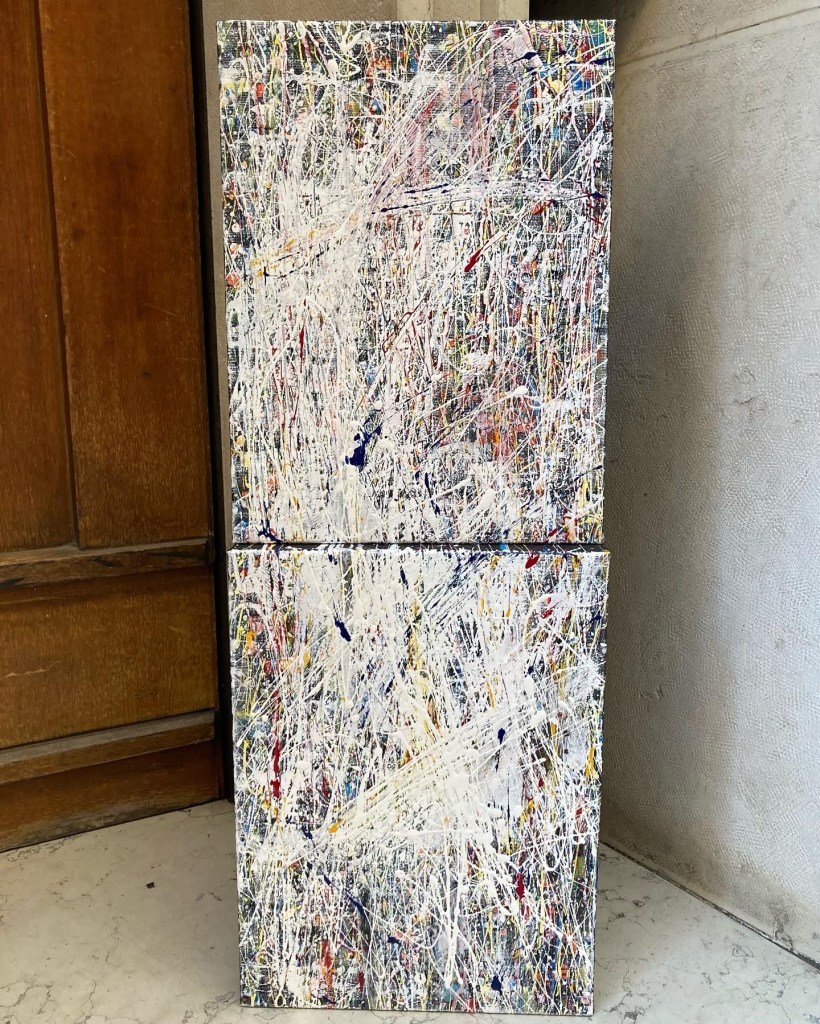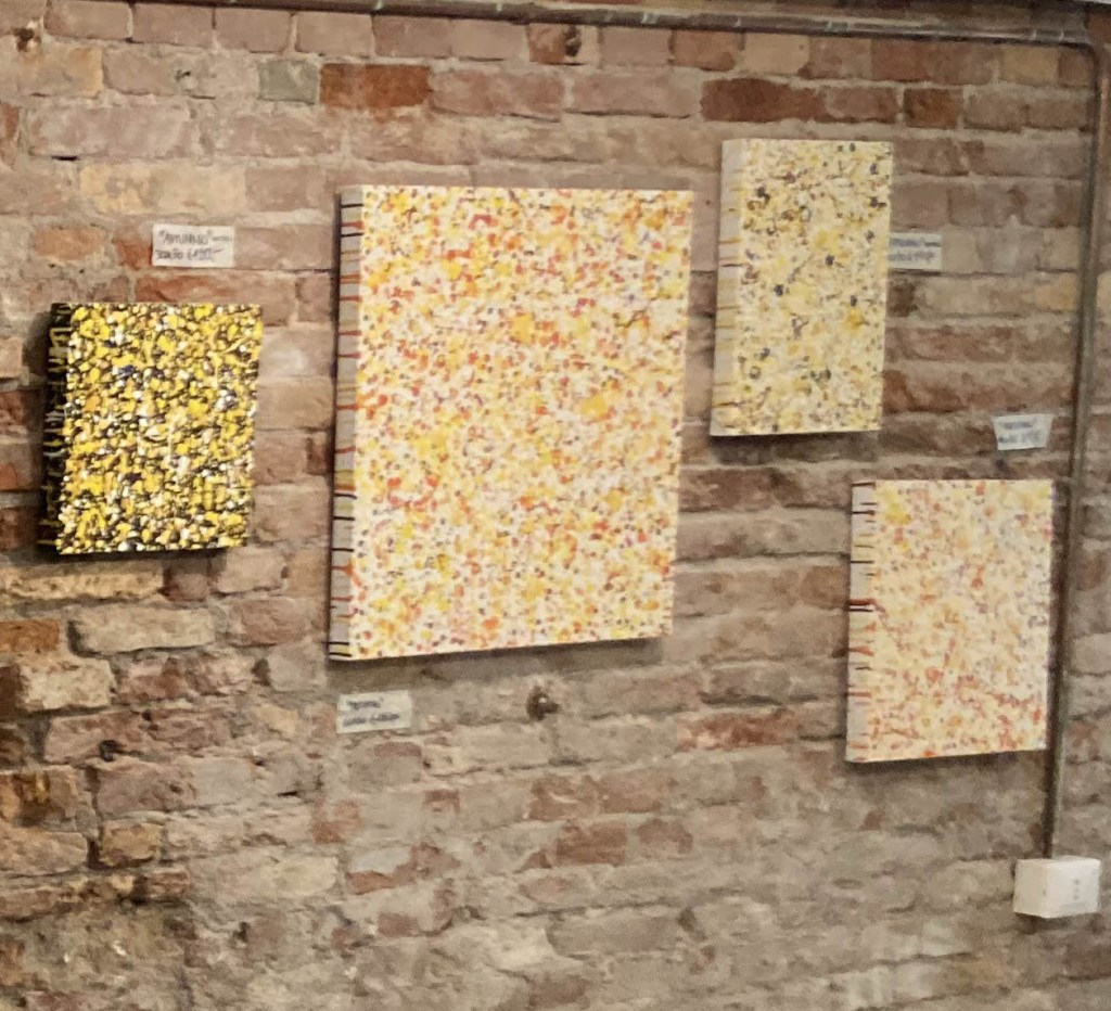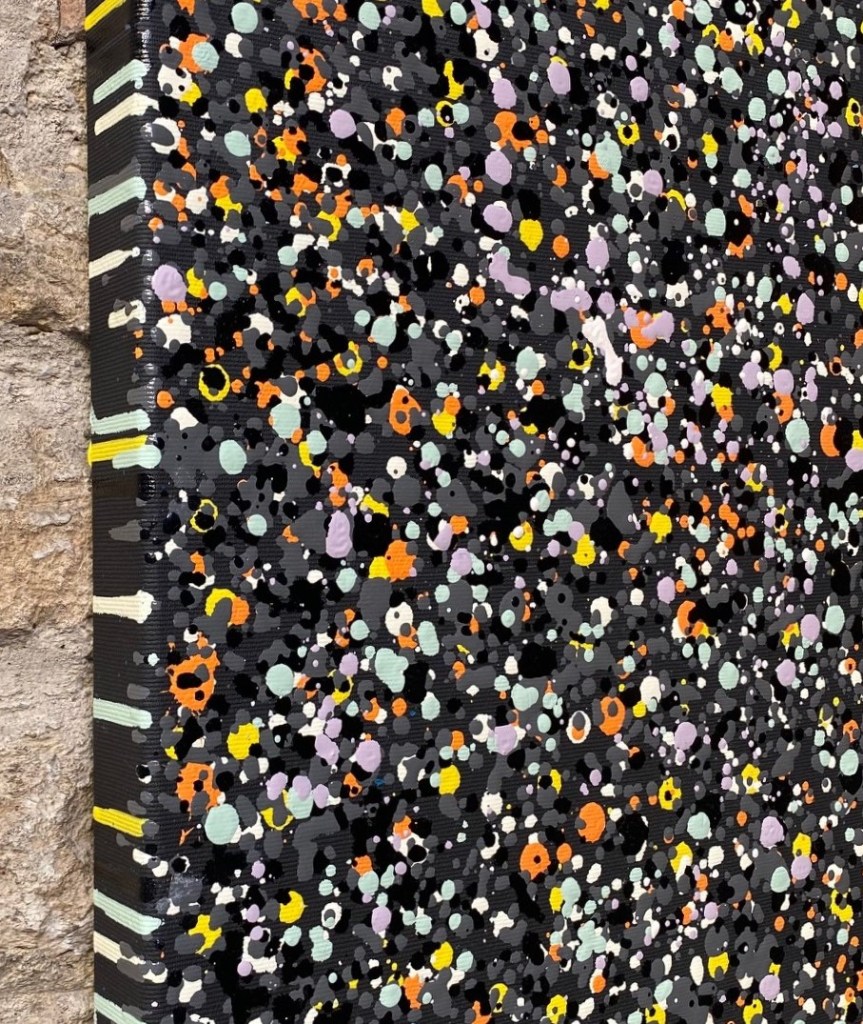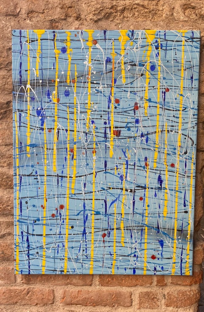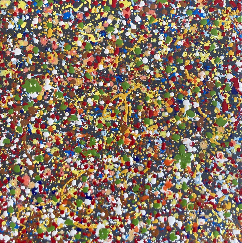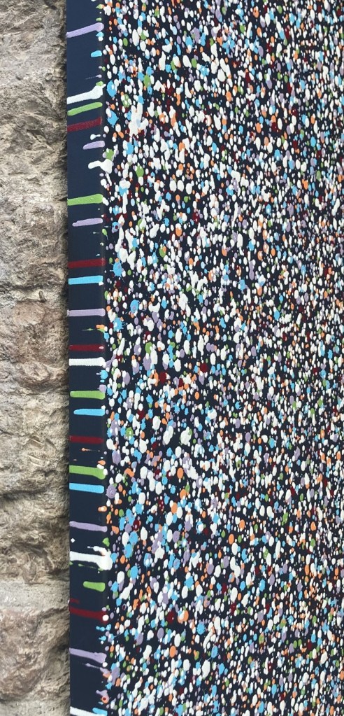 Una moltitudine di gocce e colature dall’alto che rimangono fissate sulla tela, alcune opache ma trasparenti, altre lucide e in rilievo come bottoncini nelle tonalità di diversi colori. La tela bianca, colorata o scura le accoglie generosa aspettando che si sistemino sulla sua superficie, alcune vicine, altre sovrapposte. Piccole e grandi: le diverse dimensioni donano la profondità della visione e un leggero movimento. Come molecole che vibrano in un’eterna danza. L’artista le sistema con pazienza, aspettando che scendano giù dallo strumento utilizzato a raccogliere il colore, come una sorta di meditazione. Il risultato: un microcosmo rassicurante, fresco e leggero che accoglie lo sguardo cangiante in molteplici riflessi a seconda della fonte luminosa e della posizione dello spettatore. La scelta del campo quadrato, rettangolare e rotondo determina una percezione diversa di ogni opera.