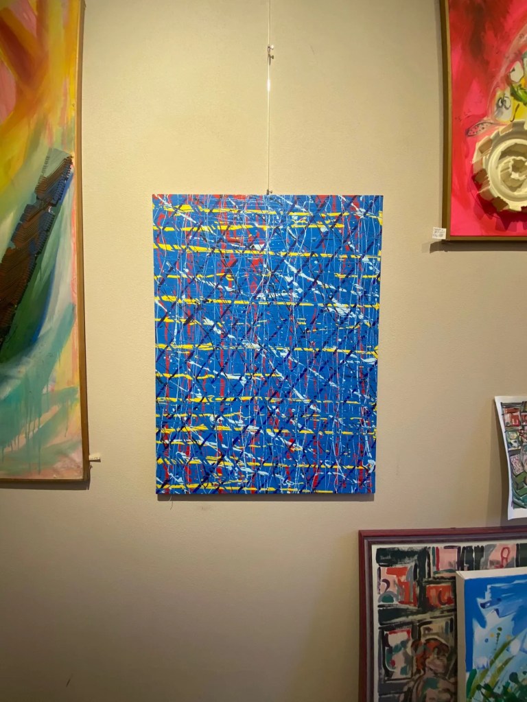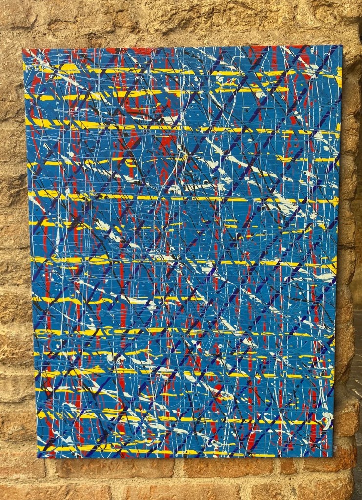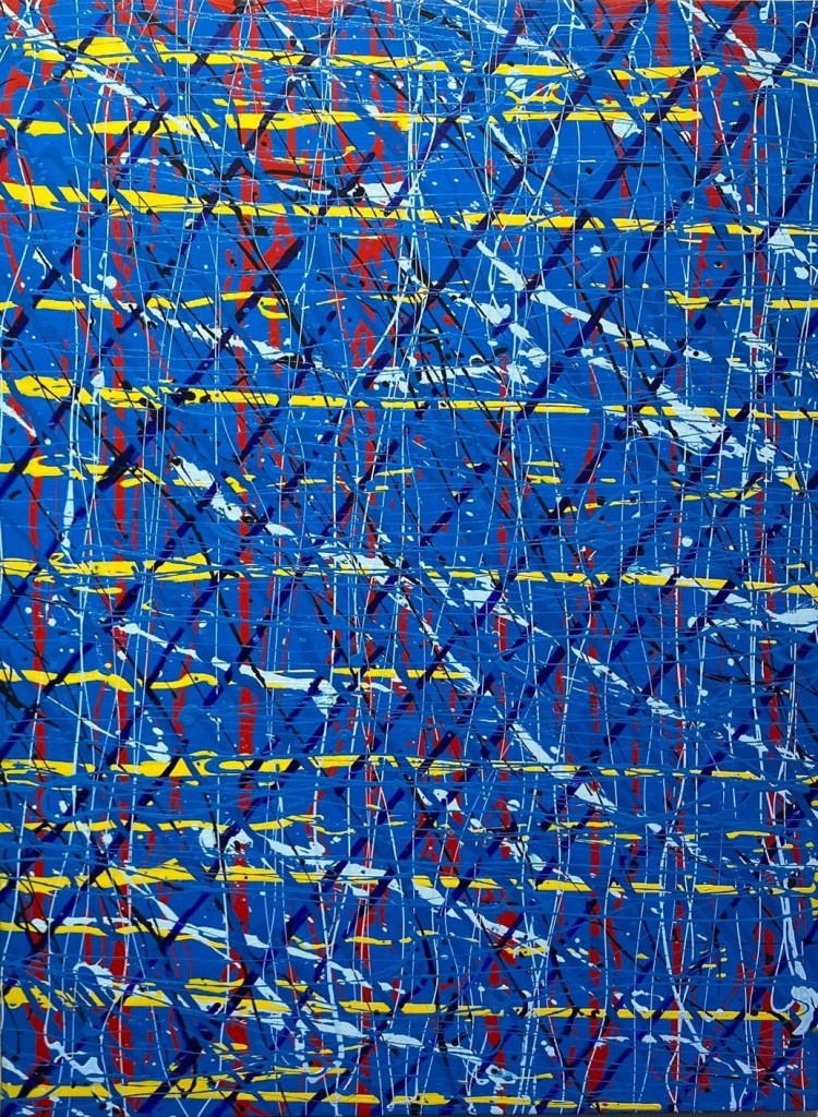 Intrecci, trame, griglie di colori blu, su base blu, danno visione dell’oltre e della profondità attraverso gli spazi tra un segno e l’altro. Come una costruzione che divide o svela.