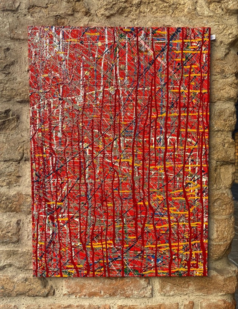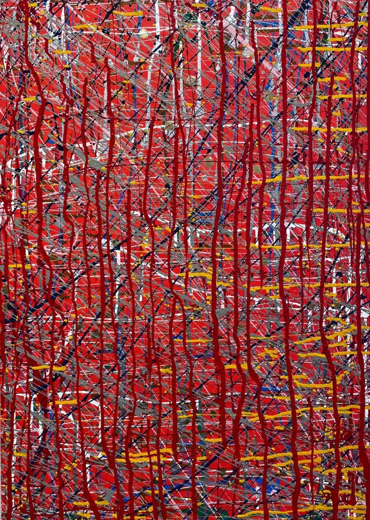 Intrecci, trame, griglie di colori rosso, su base rossa, danno visione dell’oltre e della profondità attraverso gli spazi tra un segno e l’altro. Come una costruzione che divide o svela.