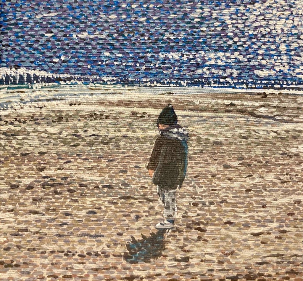 L’immagine rappresenta il ritratto di un bambino sulla riva del mare a Sottomarina in inverno. Le ombre lunghe sulla sabbia e i riflessi argentei sull’acqua denotano la particolarità della stagione e gli conferiscono una delicata nostalgia.