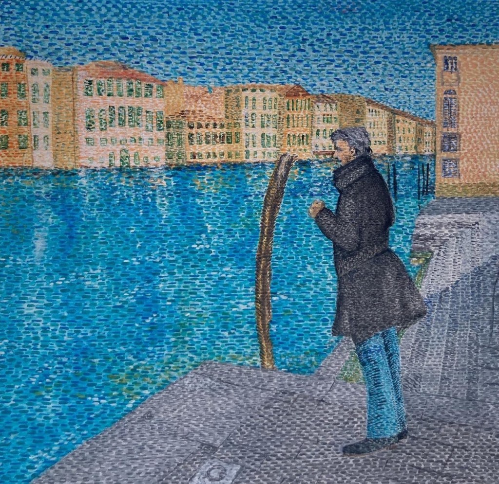Ritratto di una figura solitaria singolare, uomo in attesa, presso l’imbarcadero veneziano. Poesia Visiva.