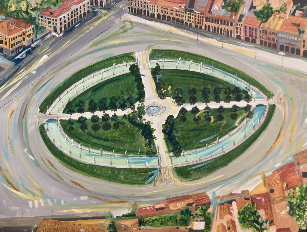 Il Prato della Valle di Padova visto dall’alto senza nessun presente, solo tracce di veloci passaggi come di auto velocissime che lasciano solo la scia..
